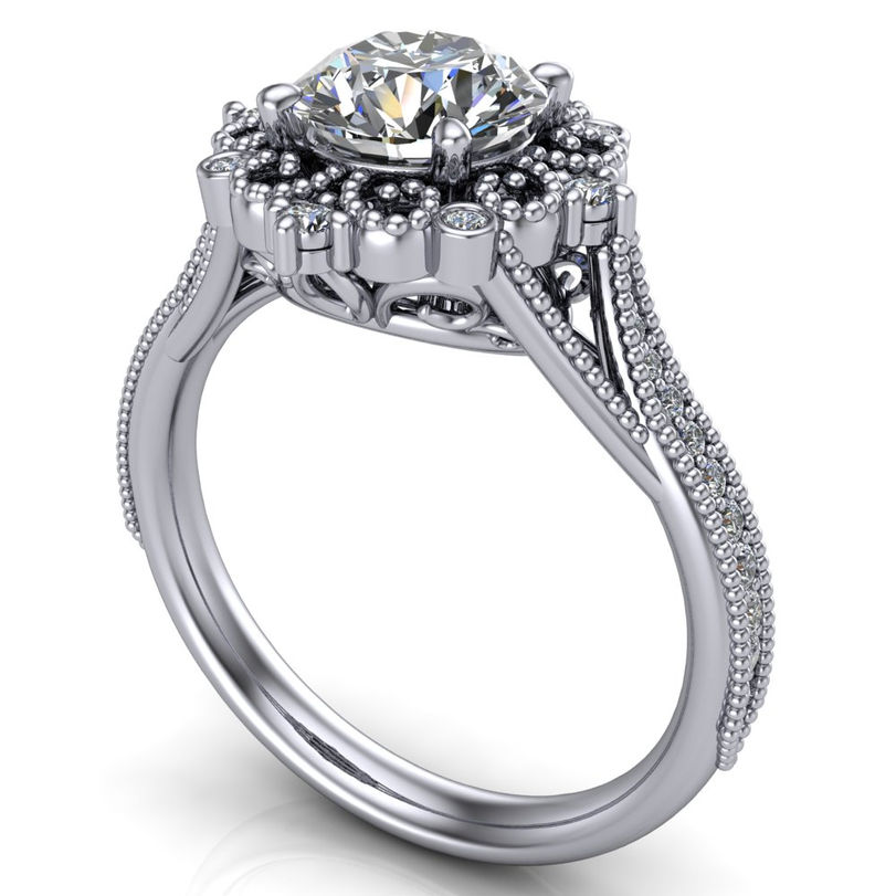 Current design holds a 6mm x 6mm round Near Colorless Moissanite or stone of your choice (contact us for pricing on different gemstone center)