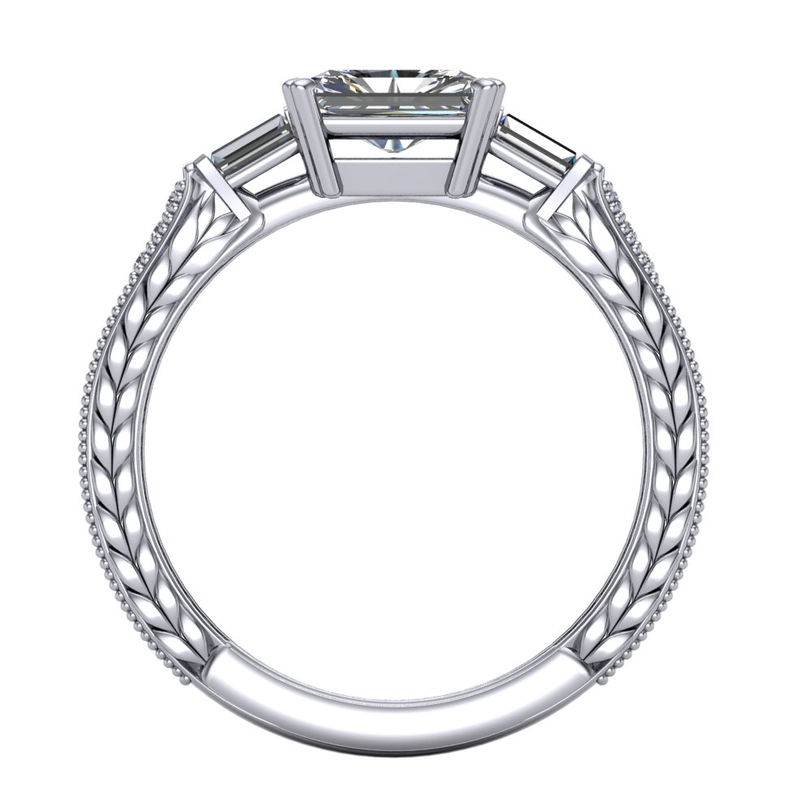 Current design holds a 6mm x 4mm Radiant Near Colorless Moissanite or stone of your choice (contact us for pricing on different gemstone center)